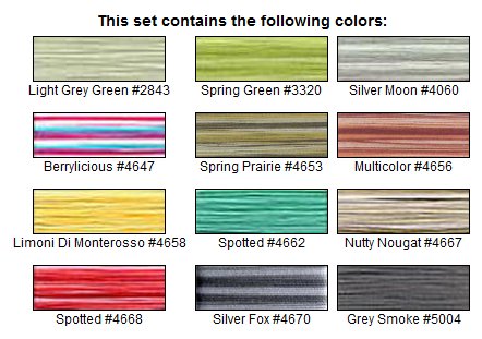 12 large spools of 50wt cotton Mako thread. There is one spool of each of the following colors: 4667, 4668, 4656, 4658, 4653, 3320, 4662, 4647, 2843, 4060, 5004 and 4670.