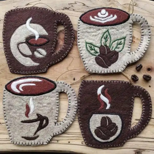 Craft four cozy 4" x 4" coffee mug ornaments in warm, coffee-inspired colors. Each kit includes woolfelt, floss, templates, and full-color illustrated instructions. Ornaments feature open tops, perfect for gift cards. Simply cut pieces using included templates, applique in place, and follow the step-by-step guide. Add optional decorative stitches or personalize with your own embellishments. Easy and fun for all skill levels.