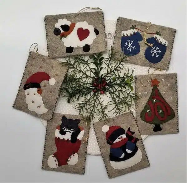 Designs include: snowman, Santa, sheep, tree, mittens, and kitten in stocking