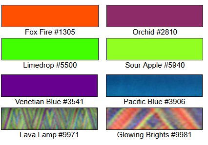 Contains 6 spools of Mettler Polysheen and 2 spools of Mettler Polysheen Multi Embroidery thread. Colors- Fox Fire 1305, Orchid 2810, Venetian Blue 3541, Pacific Blue 3906, Limedrop 5500, Sour Apple 5940, Lava Lamp 9971, and Glowing Brights 9981.