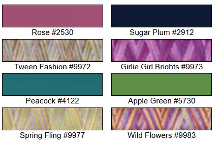 Contains 4 spools of Mettler Polysheen and 4 spools of Mettler Polysheen Multi Embroidery thread. Colors- Rose 2530, Sugar Plum 2912, Peacock 4122, Apple Green 5730, Tween Fashion 9972, Girlie Girl Brights 9973, Spring Fling 9977, Wild Flowers 9983.