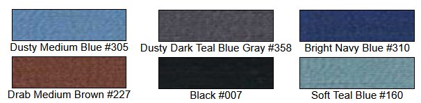 Cadet includes Black #007, Soft Teal Blue #160, Drab Medium Brown #227, Dusty Medium Blue #305, Bright Navy Blue #310, Dusty Dark Teal Blue Gray #358.
